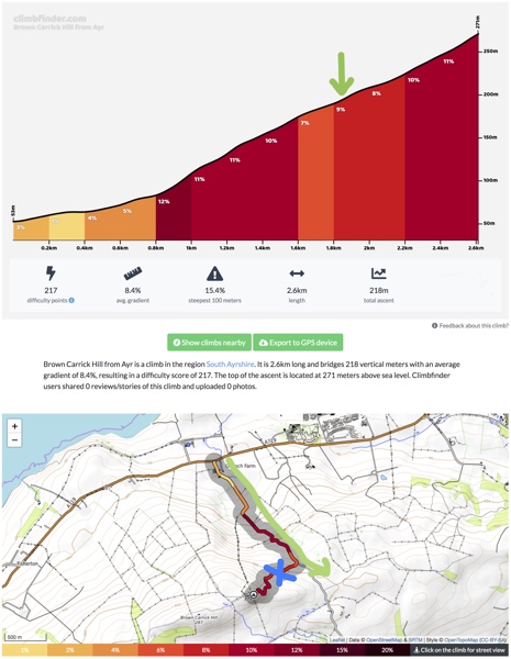 The road portion (not going to the summit) of this hill is c. 200m over 2km (7.3% average gradient) so not too bad.
