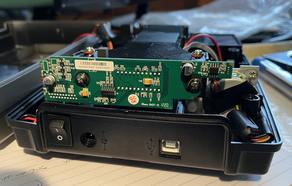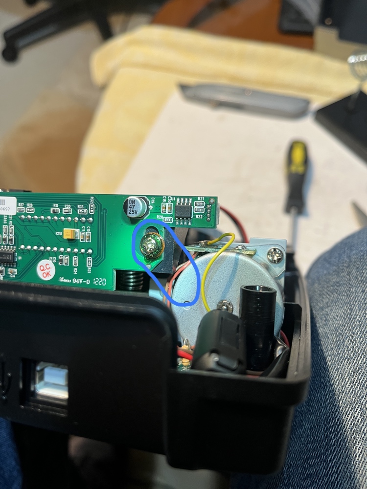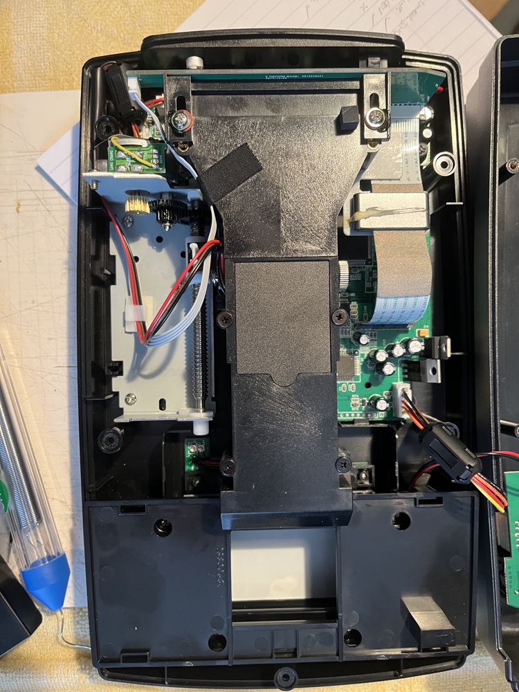 Some snaps showing problem areas - basically the wires going to the stepper motor control board are glued (or should be) to the stepper motor but the sensor gantry moves past the motor with very little room to spare. In my case the yellow wire was caught and broke away and the others would have been also if it wasn't for the fact that the righthand screw holding the PCB on the back of the gantry was loose and causing a misalignment of the sensor. The fix was to resolder the yellow wire and reroute the other wires across the back of the motor (using duct tape to keep them there) and allow the gantry to move freely past the motor. The righthand screw was also adjusted to correct the misalignment of the sensor. The build quality is shoddy.