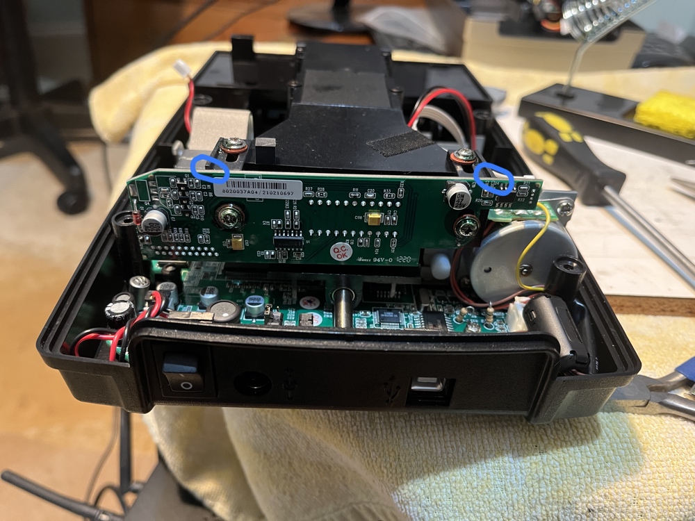 Gantry rear prior to fix (note: blue circles showing uneven positioning of PCB - compare with next snap)