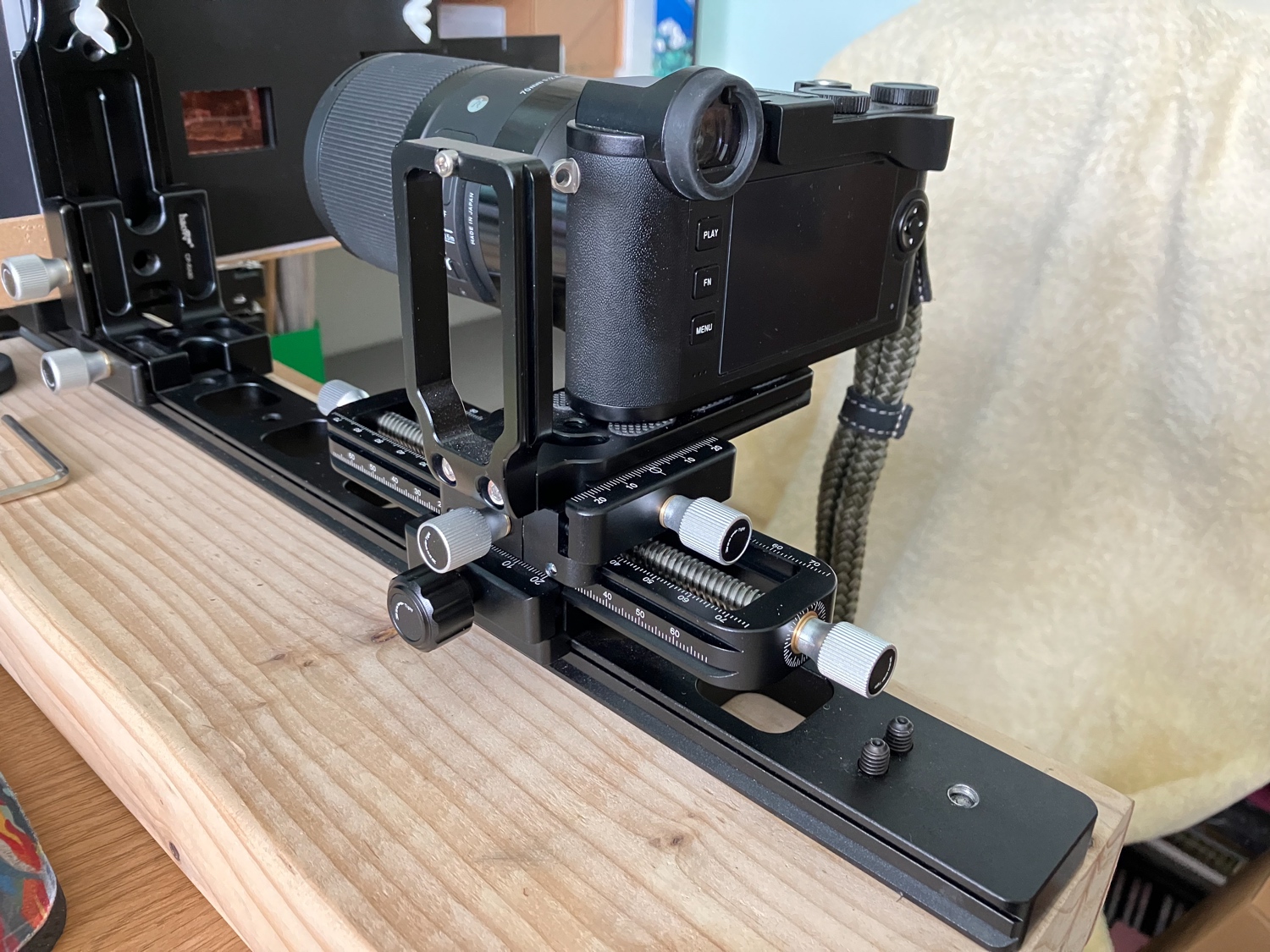 I have chosen a horizontal scanning arrangement rather than the more ubiquitous vertical arrangement and it uses a variety of Arca-Swiss compatible components - basically the main rail is screwed to a substantial piece of wood to provide a stable base. The rail is set to one side to allow the camera to overhang a bit so the battery/card compartment can be accessed relatively easily.
