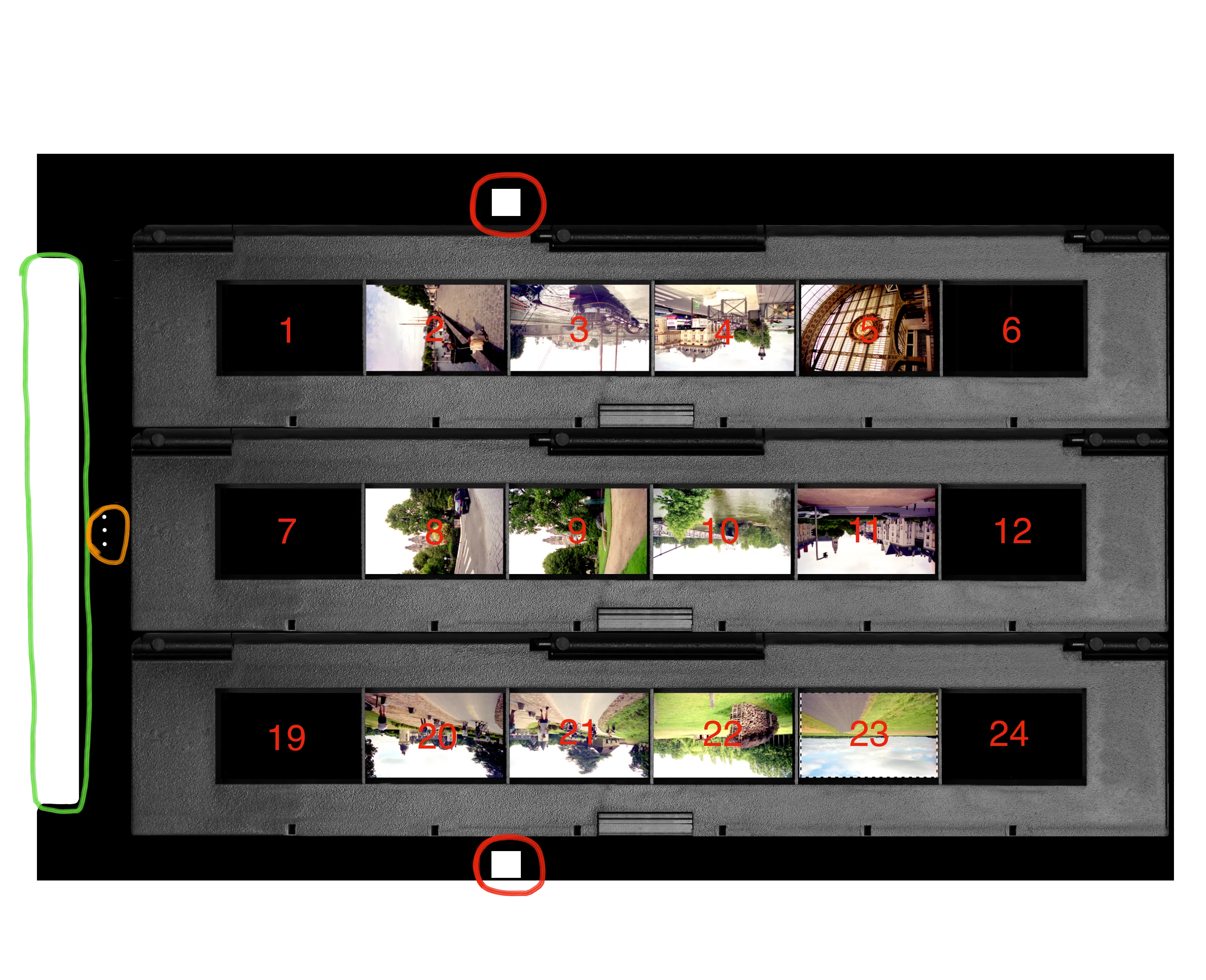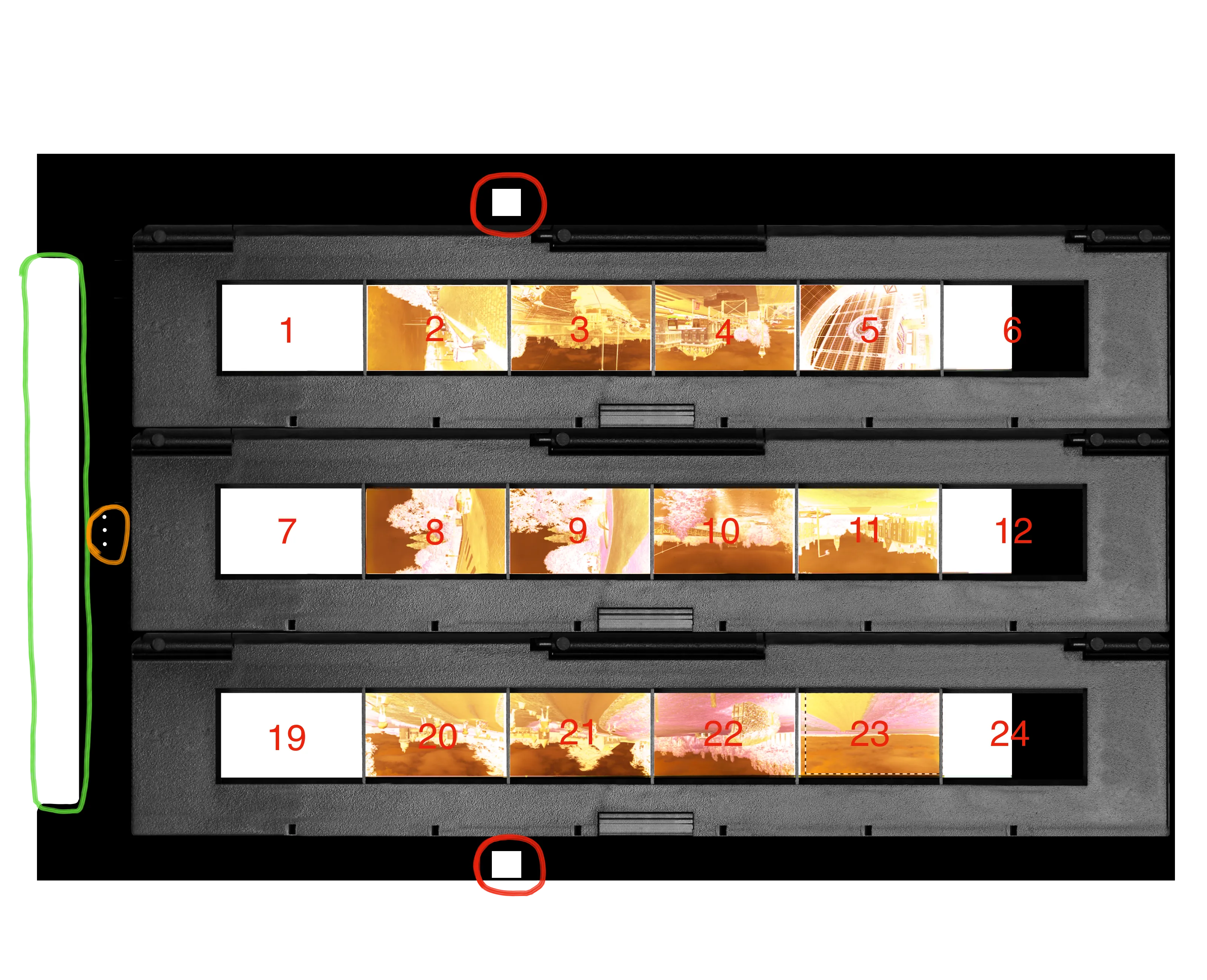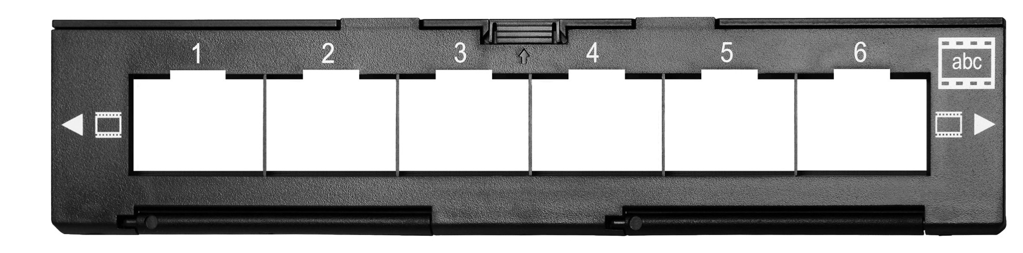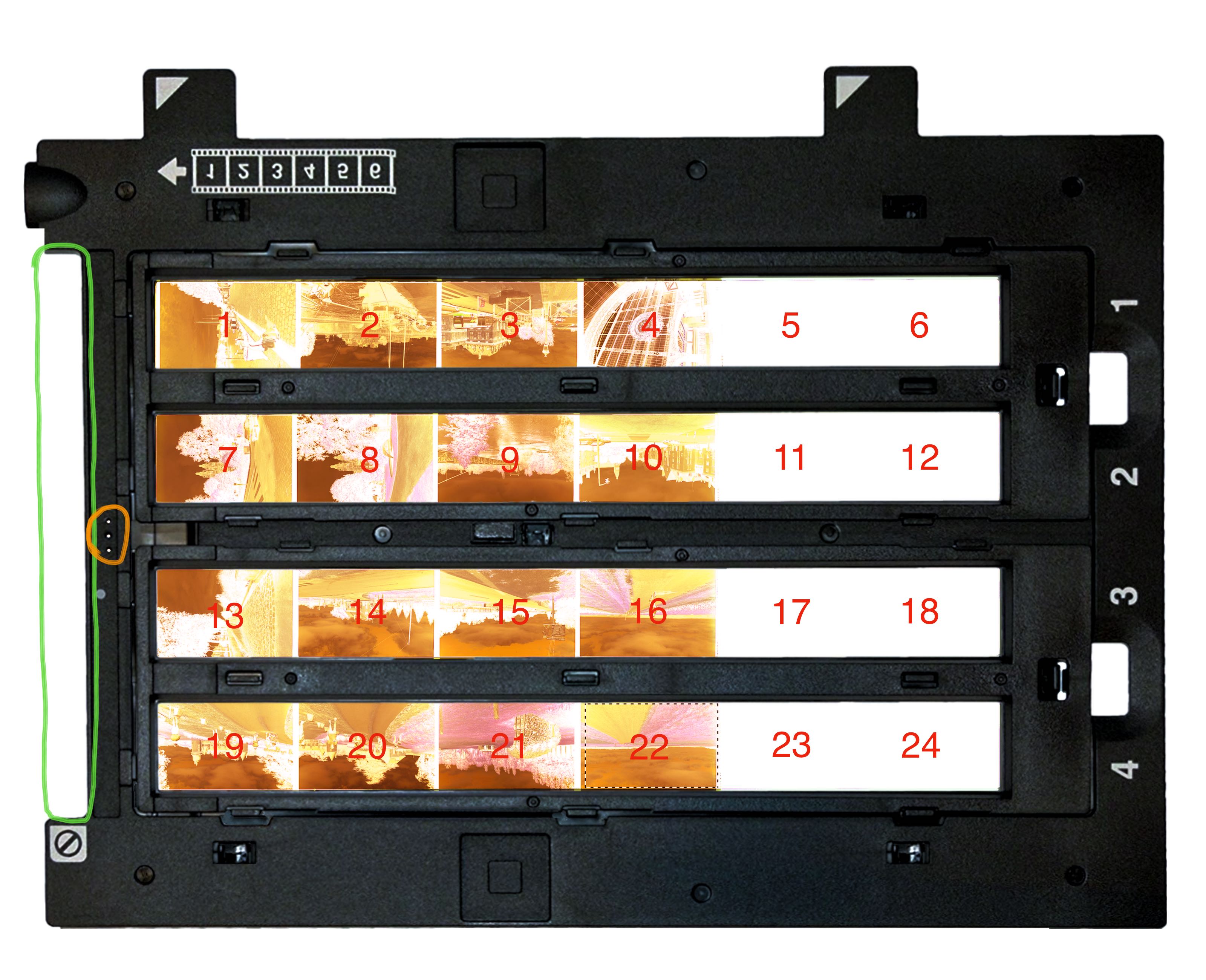 Film holder for 35mm negatives showing frame numbering (height adjustment stubs circled in red) -