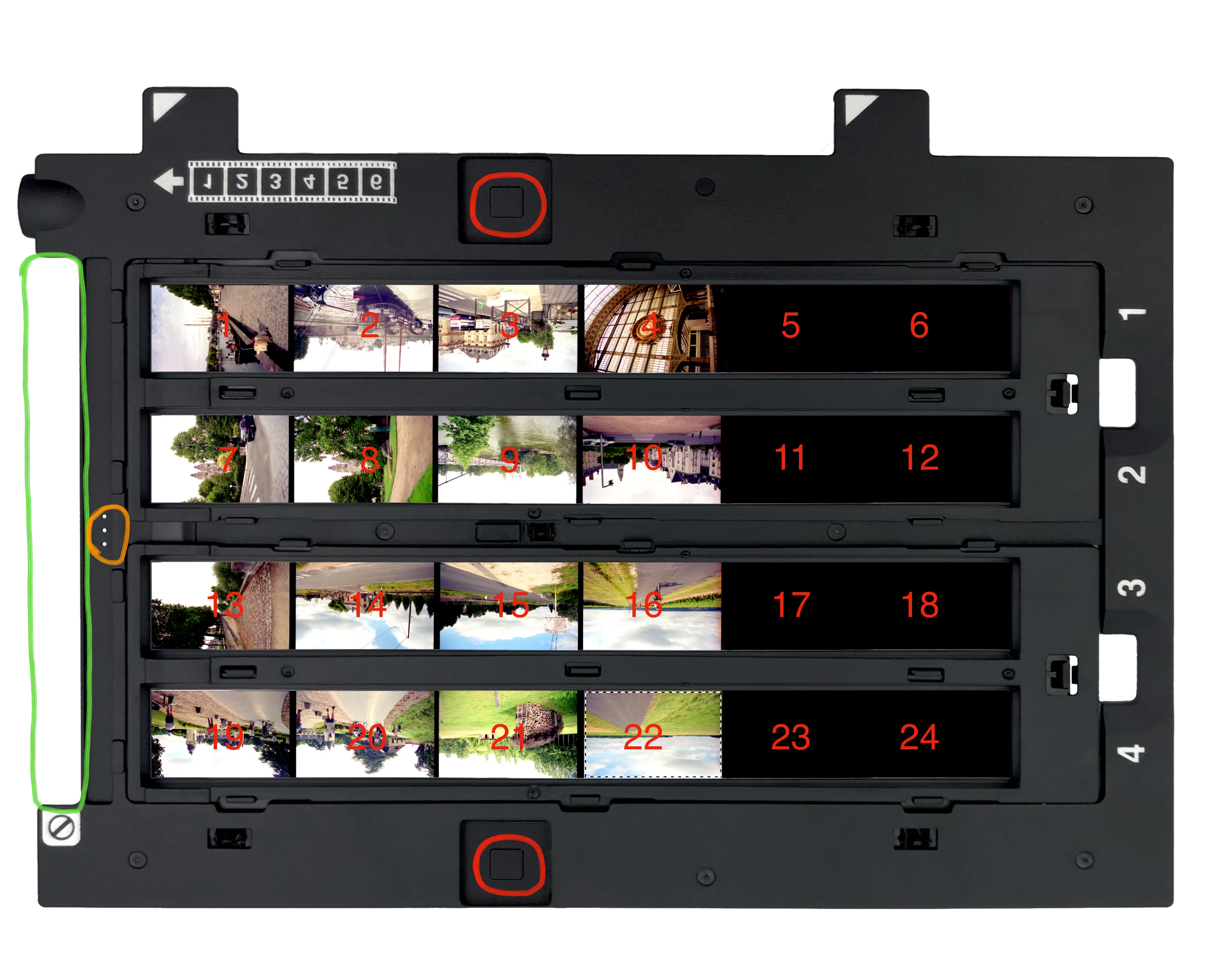 Film holder for 35mm negatives showing frame numbering (height adjustment stubs circled in red) -